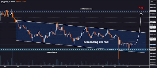 Oprócz tych sygnałów wykres SHIB pokazuje kanał spadkowy zbliżający się do fazy końcowej. Struktura kanału pozostaje nienaruszona. Kompresja cenowa narasta w miarę zbliżania się tokena do linii środkowej. Wskazuje to na potencjalne wybicie i wzmacnia pozytywne perspektywy dla SHIB. Cele odbicia dla SHIB to 0,00001150 USD, 0,00001410 USD, 0,00001570 USD, 0,00001770 USD, 0,00002020 USD i potencjalnie 0,00002370 USD. Jeśli cena skutecznie przebije linię środkową, może to wywołać znaczący rajd w nadchodzących tygodniach.