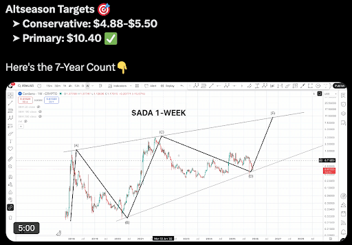 Wykres wskazuje wcześniejsze punkty cyklu, w tym szczyt z 2018 roku, dołek z 2020 roku i szczyt z 2021 roku. ADA jest obecnie wyceniana w fazie korekty, utrzymując się powyżej wsparcia kanału. Struktura sugeruje kontynuację trendu w ramach istniejącego wzorca. Według jego analizy, jeśli cena ADA utrzyma ten trend, w 2026 roku przewidywany jest wzrost do 4 dolarów. Jest to konserwatywna prognoza, a analityk przewiduje nawet wzrost do 10 dolarów.
