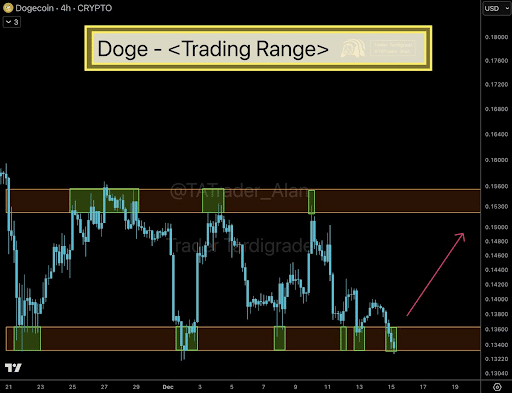 Cena Dogecoina nadal jest ustalana w ramach znanej struktury technicznej, gdy analitycy porównują bieżące ruchy z poprzednimi cyklami. Analityk rynku Tardigrade zauważył, że ruch cenowy DOGE przypomina wcześniejsze fazy akumulacji. Na wykresie czterogodzinnym Dogecoin testował dolną granicę swojego poziomu transakcji.