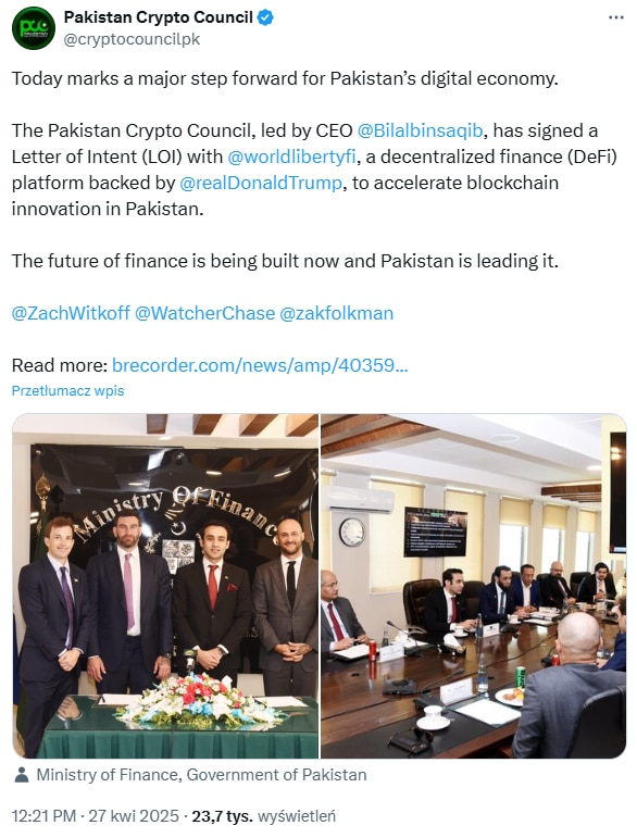Wspierana przez prezydenta Donalda Trumpa platforma DeFi World Liberty Financial podpisała list intencyjny z Pakistańską Rada Kryptowalut (Pakistan Crypto Council, PCC), mający na celu przyspieszenie rozwoju technologii blockchain, stablecoinów oraz tokenizacji rzeczywistych aktywów w Pakistanie.