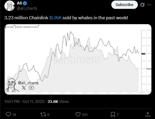 Powoli branża otrząsa się z szoku, a eksperci zaczynają analizować wydarzenia sprzed krachu. Szczególnie intrygująco wygląda aktywność wielorybów. Jak ujawnił Ali Martinez w ciągu tygodnia, którzy poprzedził krach, duzi posiadacze sprzedali łącznie 3,2 mln sztuk Chainlink. Dane, które rozpowszechnił analityk, pochodzą z renomowanej platformy „Santiment”.