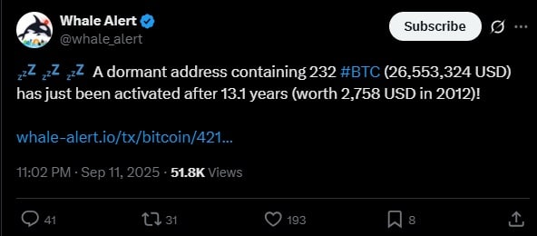 Kilka godzin temu platformy analizujące ruchy dużych graczy wytropiły właśnie jeden z takich intrygujących ruchów. Jak poinformował Whale Alert uśpiony od ponad 13 lat wieloryb uaktywnił się i przeniósł nieznaczne ilości BTC na nieznany adres. Portfel tego użytkownika zawiera 232 BTC o wartości około 26,5 mld dolarów. Co ciekawe w 2012 roku, gdy wieloryb wszedł w posiadanie tokenów, były one warte jedynie 2758 dolarów.