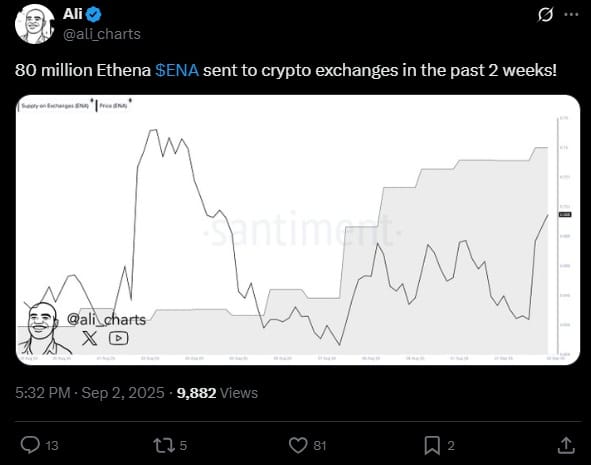 Niestety sygnały ze strony wielorybów nie dają nadziei na to, że token odzyska większą dynamikę i odrobi szybko straty. Jak poinformował Ali Martinez, w ciągu ostatnich dwóch tygodni wieloryby przeniosły na giełdy 80 mln sztuk ENA. Dane, które rozpowszechnił Martinez na swoim X, pochodzą z renomowanej platformy analitycznej „Santiment”.