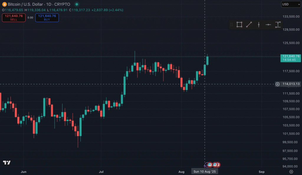 Ostatnie siedem dni przyniosły bitcoinowi wzrost o około 6,5 procent. Tylko w niedzielę cena wzrosła o dodatkowe 2,5 procent. Dla weekendu, który zwykle bywa spokojniejszy, jest to wynik wyjątkowy. Notowania utrzymały się zdecydowanie powyżej granicy 120 tys. USD, co wzmocniło nastroje byków na rynku.