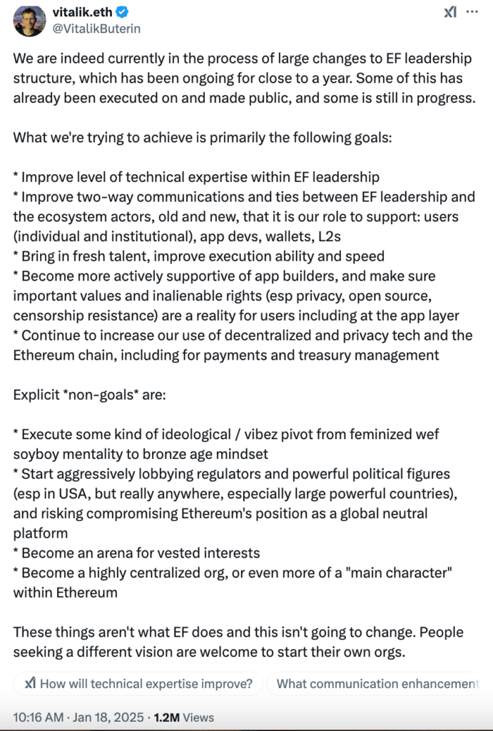 W poście opublikowanym 18 stycznia na platformie X, Buterin przedstawił cele zmian w Fundacji Ethereum. Kluczowe priorytety obejmują wsparcie dla deweloperów aplikacji zdecentralizowanych (dApps), wspieranie decentralizacji oraz zwiększenie odporności na cenzurę i ochrony prywatności.