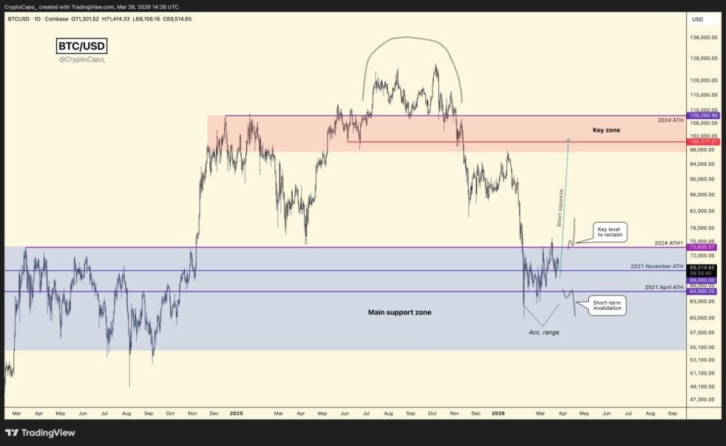 Bitcoin wciąż porusza się w szerokim przedziale od 65 do 75 tys. dolarów, a zdaniem legendarnego tradera działającego pod pseudonimem Il Capo of Crypto dopiero trwałe wybicie ponad górne ograniczenie tego zakresu byłoby mocnym sygnałem oznaczającym powrót byków do gry. W krótkim terminie kluczowe pozostaje więc to, czy rynek odzyska poziom 75 tys. dolarów, czy przeciwnie — zejdzie poniżej 65 tys. dolarów i podważy optymistyczny scenariusz.
