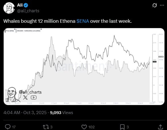 Jak poinformował Ali Martinez w jednym z najnowszych wpisów na X, tylko w tym tygodniu wieloryby kupiły aż 12 mln sztuk ENA. Trend nie jest jeszcze tak silny, jak w miesiącach wakacyjnych, w trakcie których altcoin gwałtownie rósł. Jednak jest to największa aktywność wielorybów od końca sierpnia. Dane, które rozpowszechnił analityk, pochodzą z renomowanej platformy analitycznej „Santiment”.