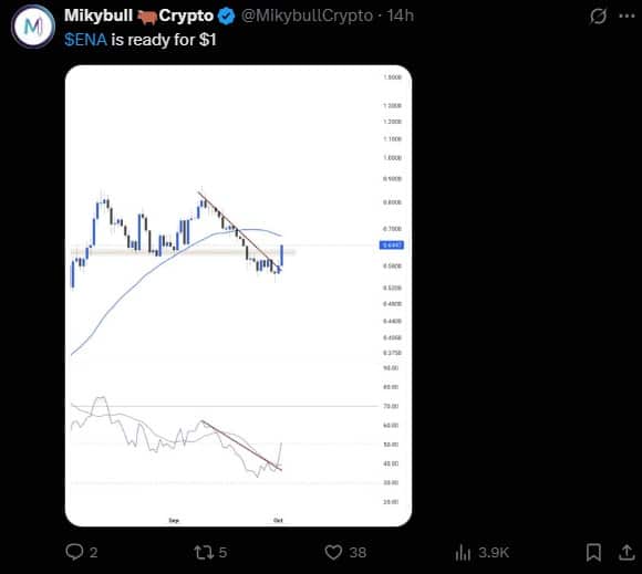 Nawet po tych rajdach do ATH było jeszcze daleko. Najwyższy poziom cen altcoin zanotował w 2024 roku, gdy kosztował maksymalnie 1,52 USD. Wieloryby, które się nim interesują, prawdopodobnie coś przeczuwają. Prognozy ekspertów również wyglądają optymistycznie. Mikybull Crypto w jednym z ostatnich postów na X ocenił, że „ENA jest gotowa na 1 dolara”. Z pewnością warto obserwować, czy obecne trendy wokół ENA utrzymają się w kolejnych dniach.