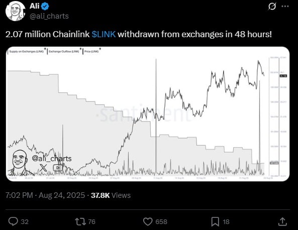 Dość intrygująco, przynajmniej na pierwszy rzut oka, wyglądają dane dotyczące aktywności dużych posiadaczy Chainlink. Ali Martinez, popularny ekspert rynku kryptowalut, w jednym z ostatnich postów na X poinformował, że w trakcie weekendu (23-24 sierpnia) wieloryby wyprowadziły z giełd aż 2,07 sztuk LINK. Dane, które rozpowszechnił Martinez, pochodzą z renomowanej platformy analitycznej Santiment.