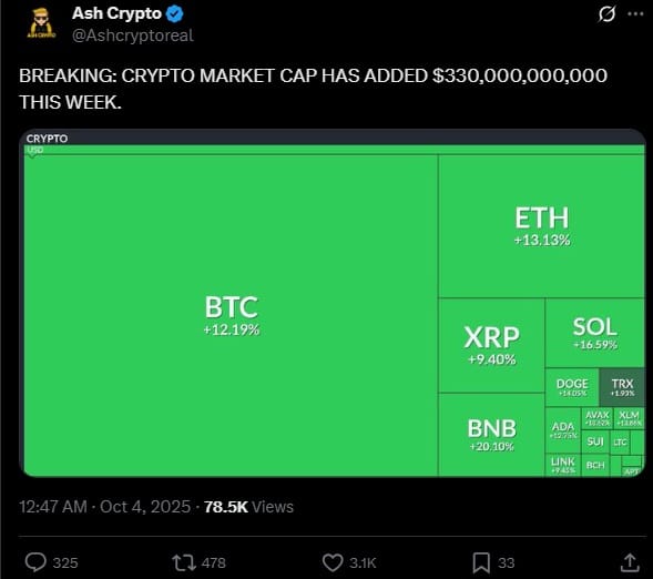 Póki co zaczęło się dobrze. Najnowsze dane wskazują, że straty zostały praktycznie odrobione. Z danych, które przedstawił Ash Crypto wynika, że w tym tygodniu rynek kryptowalut zyskał 330 mld dolarów. Jeśli dynamika zostanie zachowana, to wynik ten szybko będzie jeszcze lepszy.
