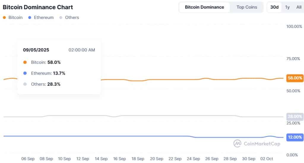Eksperci wskazują na kilka sygnałów, że zbliża się sezon na altcoiny. Jednak tym najbardziej oczywistym znakiem jest słabnąca dominacja Bitcoina. Jeśli spojrzymy na ten wskaźnik, to wygląda na to, że sytuacja jest stabilna, a BTC nie zamierza odchodzić w cień. W chwili pisania tekstu dominacja Bitcoina wynosi 58% i przez ostatni miesiąc utrzymuje się na podobnym poziomie.