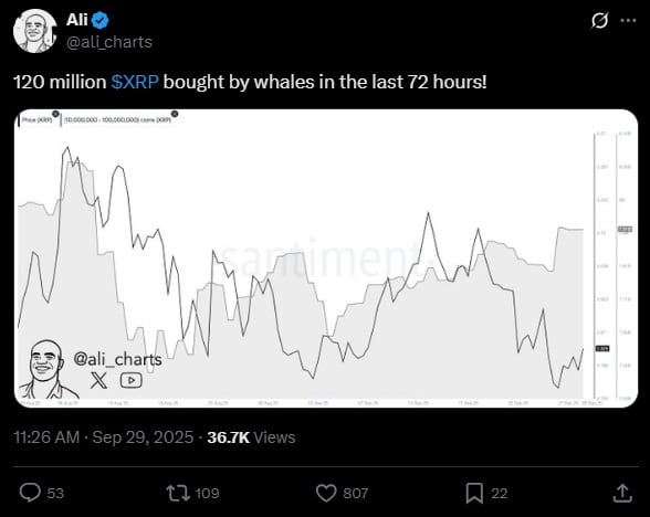 Jednak pojawiło się światełko w tunelu. Wczoraj Ali Martinez opublikował post na X, w którym poinformował, że w dniach od 26 do 28 września wieloryby kupiły łącznie 120 sztuk XRP. Nie jest to aktywność, która pozwala zachować całkowity spokój przed odblokowaniem. Jednak biorąc pod uwagę liczbę złych informacji z ostatnich dni, to wiadomość, która przynajmniej daje nadzieję.