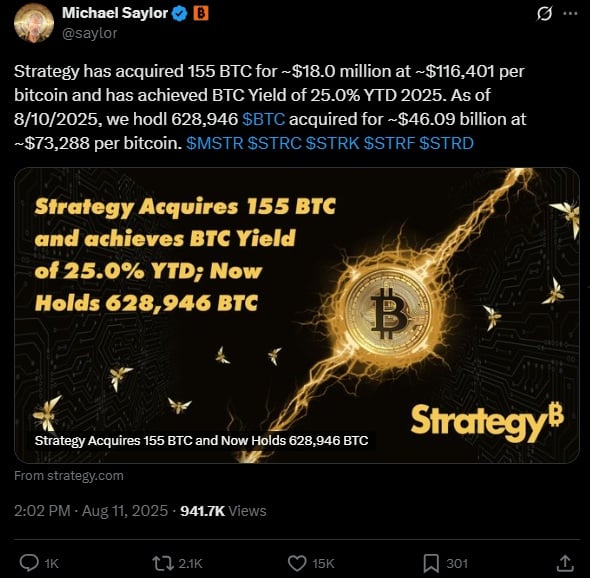 Na początku tygodnia inwestor poinformował na swoim X, że MicroStrategy nabyła 155 BTC za 18 mln dolarów. Uśredniona cena za jeden token wyniosła 116 401 tys. dolarów. Łącznie gigant posiada obecnie 628 946 BTC, a za każdą monetę firma płaciła średnio 73 288 USD. Z kolei na wszystkie tokeny łącznie wydała 46,09 mld dolarów.