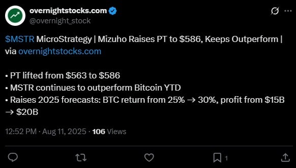 Co na to inni? Mizuho Financial Group właśnie przedstawiła najnowszą prognozę dla MicroStrategy na kolejne dwanaście miesięcy. Grupa podtrzymała dla spółki ocenę „Outperform”, co oznacza, że podmiot radzi sobie powyżej oczekiwań. Z kolei nowa cena docelowa, którą przedstawiła Mizuho jest wyższa od obecnych wyników o około 43%. Firma podniosło cenę docelową akcji Strategy z 563 do 586 USD. Mizuho podniosła swoje oczekiwania po rekordowych wynikach spółki w drugim kwartale.