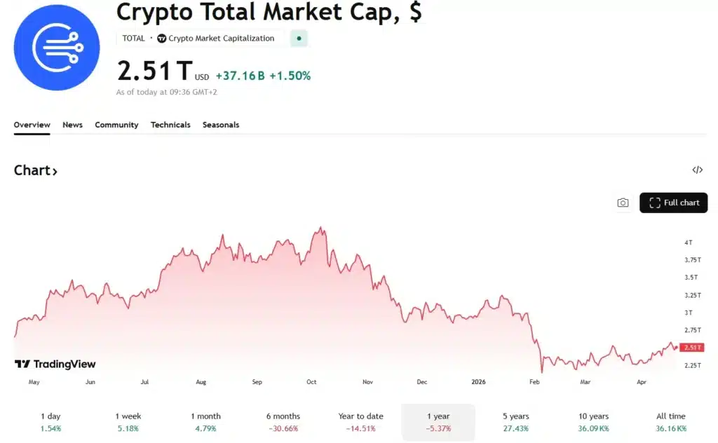 Dane dotyczące liczby unikalnych inwestorów pokrywają się z wykresem, który przedstawia aktualny poziom kapitału na rynku. Na ten moment całkowita kapitalizacja rynku kryptowalut to około 2,52 bln dolarów. W szczycie pod koniec października 2025 roku wskaźnik pokazywał 4,22 bln dolarów. Oznacza to, że od października całkowita kapitalizacja rynku kryptowalut zmniejszyła się o 40%. Bez nowych inwestorów i napływu kapitału, rozkręcenie nowej hossy wydaje się mało prawdopodobne.