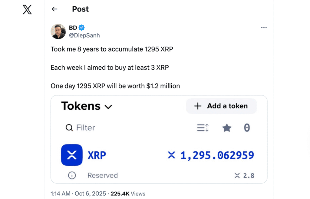 Diep Sanh, długoletni posiadacz XRP z Australii, ma przekonanie, że zajęło mu osiem lat zgromadzenie zaledwie 1295 XRP. W poście na X Sanh wyjaśnił, że jego cel był prosty: kupić co najmniej 3 XRP tygodniowo, niezależnie od ceny lub sytuacji na rynku.