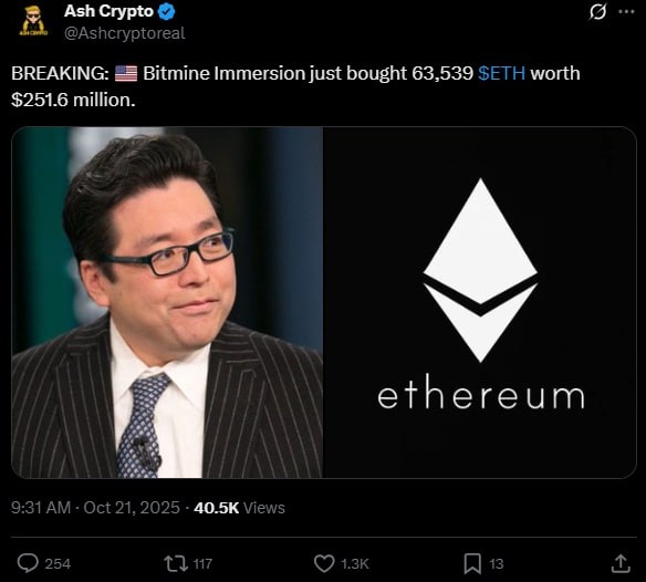 Jak poinformował Ash Crypto, na początku tego tygodnia BitMine zakupiło kolejną transzę ETH. W poniedziałek gigant wydał 251,6 mln dolarów, za które nabył łącznie 63,539 sztuk ETH. Po tej transakcji gigant posiada w swoim portfelu już 3,2 mln tokenów ETH, których wartość na dziś to około 13,4 mld dolarów.
