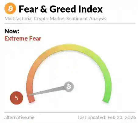 Wskaźnik Crypto Fear and Greed Index spadł do poziomu 5 na 100 punktów, co oznacza stan ekstremalnego strachu, który w historii notowań wystąpił zaledwie kilka razy.