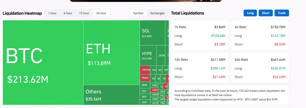 Wszystko to wydarzyło się w momencie, gdy Bitcoin gwałtownie stracił impet wypracowany podczas weekendu, spadając z poziomu około 68 600 USD w sobotę do zaledwie 64 300 USD dziś rano. Ta nagła korekta zniwelowała wszystkie ostatnie zyski i wywołała lawinę likwidacji na całym rynku kontraktów terminowych, której łączna wartość przekroczyła 468 000 000 USD. Większość tych strat, bo aż dziewięćdziesiąt trzy procent, dotyczyła pozycji długich, co jednoznacznie pokazuje, że inwestorzy byli nastawieni na wzrosty i zostali całkowicie zaskoczeni przez nagły odpływ płynności.