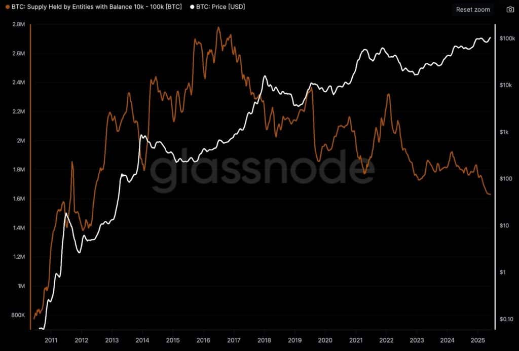 Z danych udostępnionych przez analityków Glassnode wynika, że liczba Bitcoinów należących do adresów posiadających od 10 000 do 100 000 BTC spadła o około 40% na przestrzeni ostatnich ośmiu lat. Trend ten trwa, a moment kulminacyjny przypadł na koniec maja i początek czerwca – zaraz po tym, jak Bitcoin osiągnął historyczne maksimum w okolicach 112 000 dolarów.