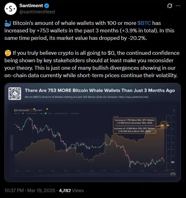 Jak ustaliła platforma analityczna Santiment, liczba portfeli Bitcoina, w których znajduje się 100 lub więcej BTC wzrosła o +753 portfele w ciągu ostatnich 3 miesięcy (+3,9%). W tym samym okresie jego wartość rynkowa spadła o -20,2%. To sygnał, że wieloryby potraktowały spadki cen jako okazję do zakupów.