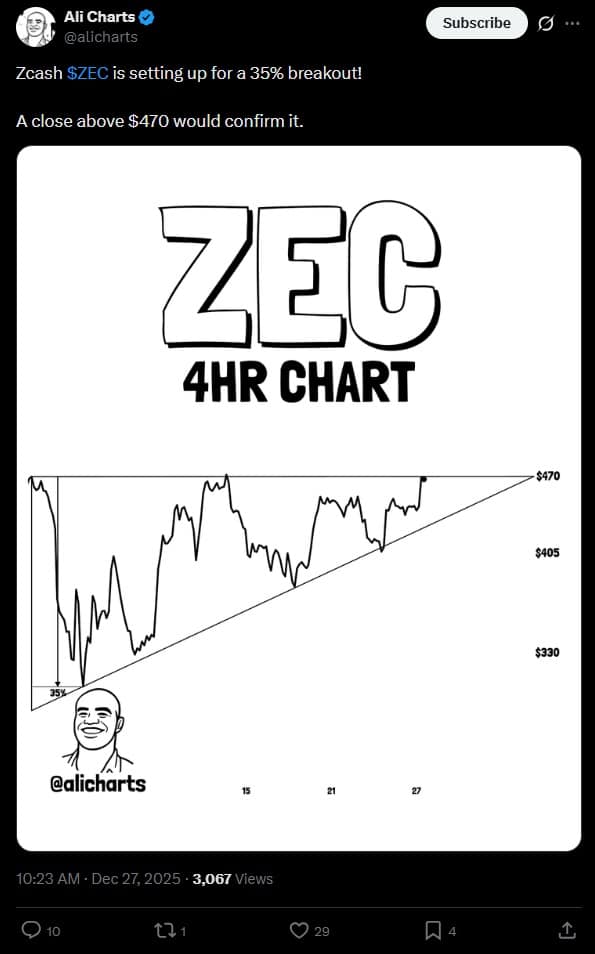 Optymistyczne dane on-chain to nie jedyny mocny sygnał dla Zcash. Eksperci zwracają również uwagę na wyniki analizy technicznej, które podpowiadają, że altcoin szykuje się na duży ruch w górę. Ali Martinez W jednym z najnowszych postów na X przedstawił wykres, na którym ZEC tworzy formację trójkąta zwyżkującego. Powszechnie przyjmuje się, że to bycza formacja, która zapowiada kontynuację trendu wzrostowego.