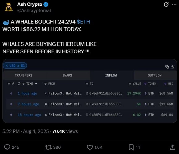 Wiele sygnałów ochłodzenia wysyłają też wieloryby, które sprzedają lub wyprowadzają swoje tokeny z giełd. Jednak nie dotyczy to wszystkich monet. Zupełnie inną strategię przyjęły wieloryby Ethereum. Ash Crypto w jednym z najnowszych postów na X poinformował, że duzi posiadacze są bardzo aktywnie. Popularny ekspert rynku kryptowalut wskazał na jednego wieloryba, który w ostatnich godzinach sam nabył ponad 24 tys. ETH za przeszło 86 mln dolarów. Zdaniem Ash Crypto „wieloryby kupują Ethereum jak nigdy wcześniej w historii”.