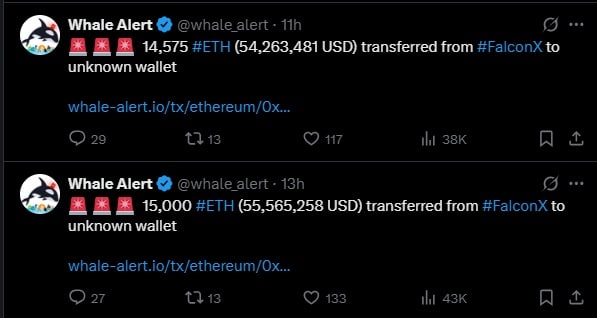 Jak pokazują liczne przykłady z Whale Alert, sporo dużych posiadaczy decyduje się na wycofanie swoich środków z giełd. W ciągu ostatnich godzin odnotowano m.in. przypadek przeniesienia ponad 14 tys. ETH z Ceffu na nieznany portfel. Podobne ruchy zauważono na FalconX skąd na nieznane portfele, w dwóch odrębnych transakcjach, przeniesiono odpowiednio 14575 oraz 15000 Ethereum.