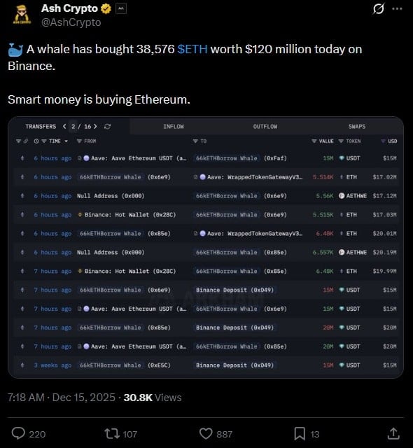 Część wielorybów po prostu kupuje i zwiększa swoje zasoby. O dużej transakcji informował kilka godzin temu Ash Crypto. Popularny ekspert opublikował dane dotyczące transakcji, w ramach której jeden wieloryb w kilku samodzielnie nabył ponad 38 tys. sztuk ETH. Na zakup tokena wieloryb wydał 120 mln dolarów.
