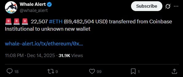 Z drugiej strony spadki spowodował, że część wielorybów zaczęła przenosić swoje monety z giełd na prywatne portfele. O takich przypadkach informuje między innym Whale Alert. Platforma, która śledzi aktywność największych posiadaczy na rynku, wytropiła wieloryba, który przeniósł z Coinbase na nieznany portfel 22,507 ETH o wartości około 69,5 mln dolarów.