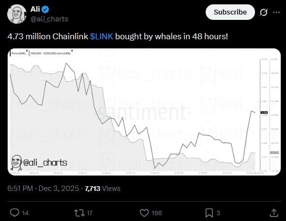 Najnowsze dane zbiorcze ujawniły, że duzi posiadacze w tym tygodniu dosłownie rzuciły się na ten token. Ali Martinez w jednym z najnowszych postów na X poinformował, że w ciągu ostatnich dwóch dni wieloryby kupiły łącznie aż 4,73 mln sztuk Chainlink. Dane, które rozpowszechnił popularny analityk, pochodzą z renomowanej platformy analitycznej „Santiment”.