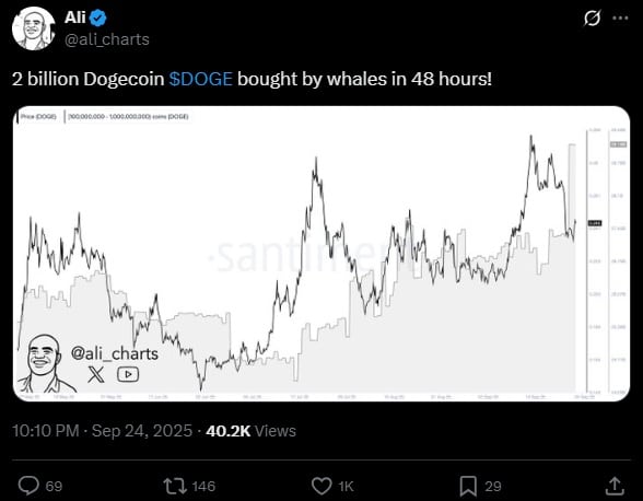 Z najnowszych danych dotyczących aktywności dużych posiadaczy wynika, że szczególnie chętnie spoglądają w kierunku DOGE. W jednym z ostatnich wpisów na X Ali Martinez poinformował, że tylko w ciągu ostatnich dwóch dni wieloryby kupiły aż 2 mld sztuk Dogecoina. Dane, które przedstawił, pochodzą z renomowanej platformy analitycznej „Santiment”.