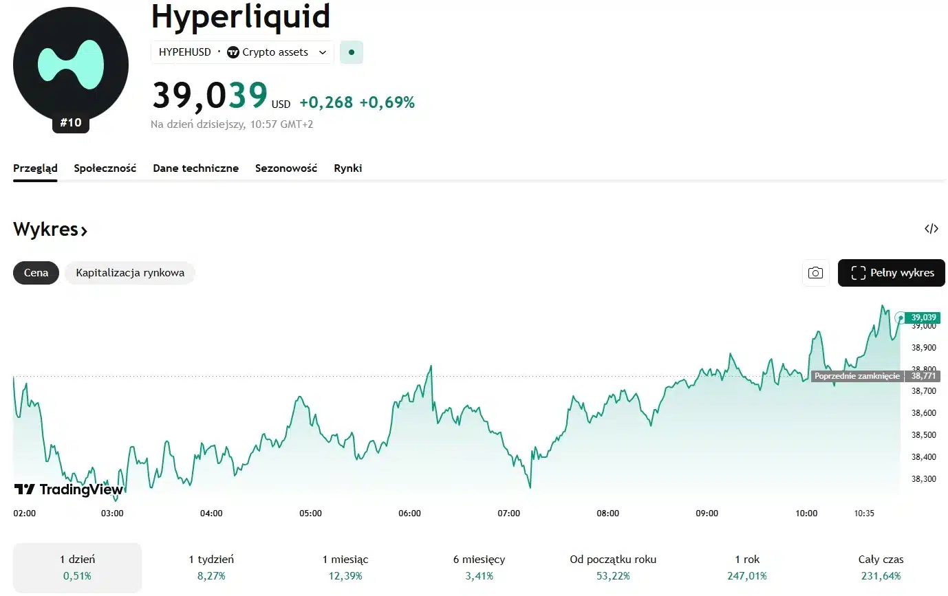 Pomimo wyjątkowo niesprzyjających okoliczności na rynkach finansowych, na każdym z nich pojawiają się projekty, które wbrew dominującym trendom potrafią generować zadowalające wyniki. Na rynku kryptowalut jednym z jaśniejszych punktów w ostatnim czasie jest Hyperliquid. Token w chwili pisania tekstu kosztuje 39 dolarów. W ujęciu tygodniowym i miesięcznym altcoin zyskał na wartości odpowiednio 8,27% oraz 12,39%. Od początku roku (Year To Date) HYPE zyskał na wartości 53,22%. Pod tym względem token zdecydowanie się wyróżnia na tle konkurencji. W ostatnich dniach ponownie wskoczył do TOP 10 największych kryptowalut pod względem całkowitej kapitalizacji.