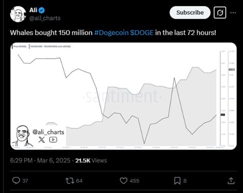 Mimo wszystko DOGE wciąż ma szansę na odwrócenie tego trendu. Jak ustalił Ali Martinez, wieloryby mocno interesują się tym memecoinem. Od początku tygodnia duzi posiadacze nabyli łącznie ponad 150 mln sztuk Dogecoina. To pokazuje, że dla wielorybów słynny memecoin wciąż ma potencjał do wzrostu.