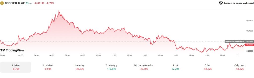 DOGE ma za sobą trudne tygodnie, które przyniosły spore spadki. W chwili pisania tekstu memecoin kosztuje zaledwie 0,20 USD, a przez ostatnią dobę stracił na wartości 0,75%. Na przestrzeni tygodnia sytuacja nieco się stabilizuje, ponieważ token traci tylko 0,4%. Sporo gorzej jest, gdy spojrzymy na dane za ostatni miesiąć. W trakcie ostatnich trzydziestu dni Dogecoin stracił 28,73%.