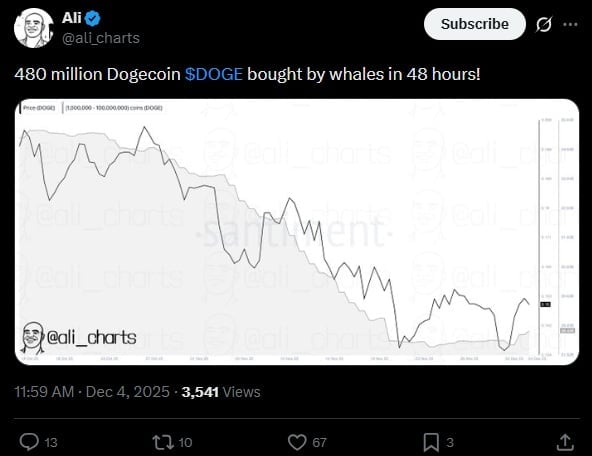Wysoko na ich liście życzeń największych posiadaczy na rynku w tym tygodniu był Dogecoin. Jak poinformował Ali Martinez w jednym z ostatnich wpisów na X, wieloryby kupiły aż 480 mln DOGE w zaledwie dwa dni. Dane, które rozpowszechnił popularny ekspert, pochodzą z renomowanej platformy analitycznej „Santiment”.