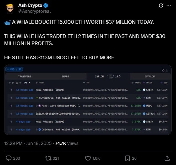Okazuje się, że ten wieloryb ma wyjątkowe wyczucie, ponieważ w przeszłości zyskał na handlu ETH około 30 mln dolarów.