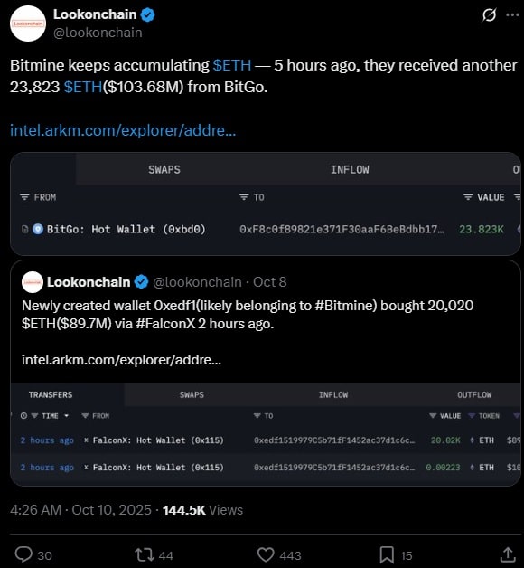 W piątek BitMine Immersion, za którym stoi Tom Lee, poinformował, że nabył 23 823 ETH o wartości 103,7 mln USD. Po tych zakupach gigant ma już na swoim koncie 2,83 mln sztuk Ethereum o łącznej wartości około 12,4 mld dolarów. Tym samym BitMine umocniło się na pozycji lidera wśród największych korporacyjnych posiadaczy tej kryptowaluty. Transakcje wykryła platforma Lookonchain, która specjalizuje się w identyfikowaniu dużych ruchów na rynku.