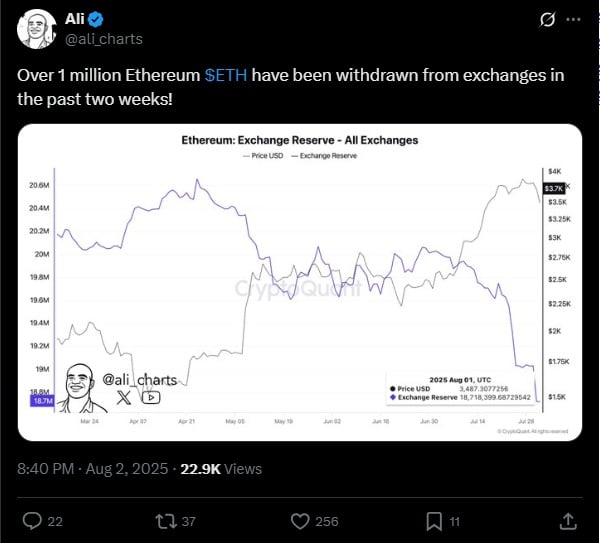 Na ostatnie spadki zareagowały również wieloryby, które spowodowały swoimi działaniami sporo szumu. Jak przekazała Ali Martinez w jednym z najnowszych wpisów na X, w ciągu ostatnich dwóch tygodni wieloryby wyprowadziły z giełd ponad 1 mln sztuk ETH. To sygnał, że duzi posiadacze oczekują kolejnych wzrostów w przyszłości, ale wolą przechować swoje zasoby w bezpieczniejszym miejscu, niż giełdy.
