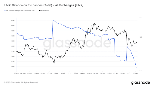 Załączony wykres pokazuje, że podaż tokena LINK na giełdach gwałtownie wzrosła po krachu na rynku w połowie października, ale od tego czasu nadal spada. Co ciekawe, wypłaty z giełd scentralizowanych sugerują, że uczestnicy rynku przenoszą token do portfeli self-custody w celu potencjalnego przechowywania, zmniejszając tym samym natychmiastową presję na sprzedaż.