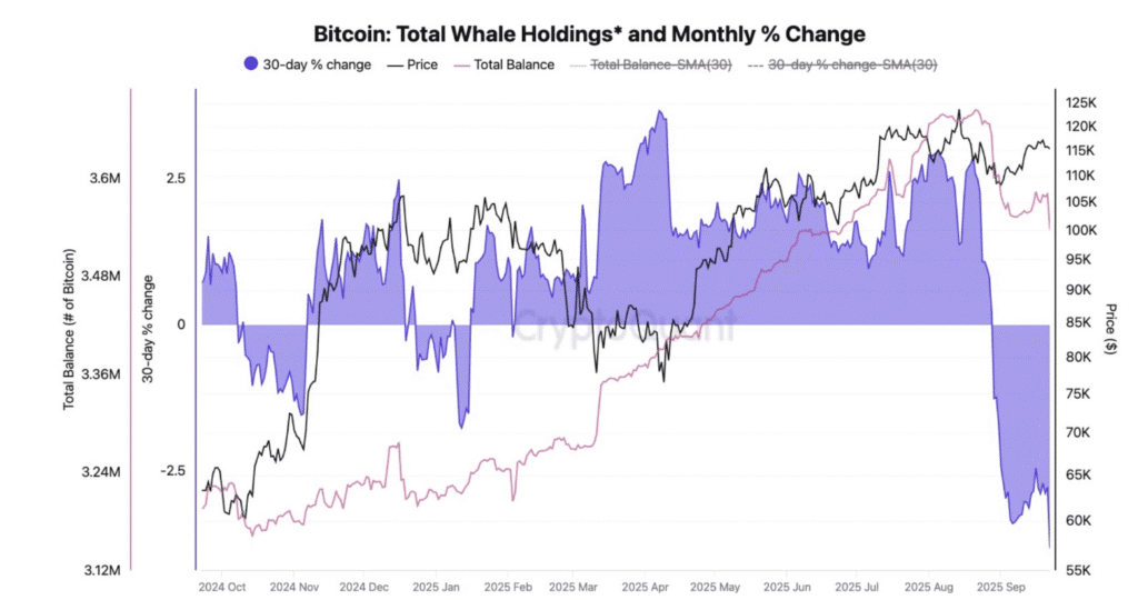 Na początku sierpnia Bitcoin osiągnął nowy rekord – 124 500 dolarów. Od tego momentu wieloryby zaczęły wyraźnie redukować swoje pozycje. Według danych CryptoQuant to najszybszy spadek ich sald w tej hossie – aż 2,7% w jeden miesiąc.