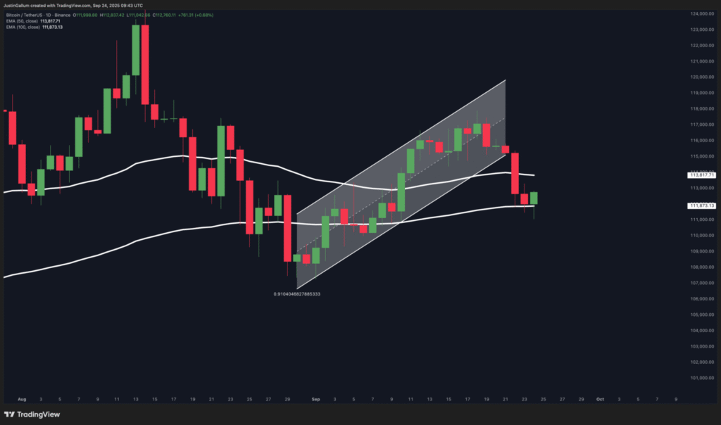 Jeśli wsparcie zostanie przełamane, scenariusz „bear flag” wskazuje na spadek nawet do 100000 dolarów. Byłby to ruch o około 11% w dół od bieżącego poziomu 112662 $.