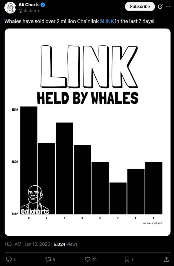 W przypadku Chainlink wejście do elity nie będzie łatwe, a w ostatnich dniach mocno się oddaliło. Altcoin mocno stracił w oczach największych graczy. Ali Martinez w jednym z ostatnich wpisów na X poinformował, że w minionym tygodniu wieloryby sprzedały łącznie aż 2 mln sztuk LINK. Dane, które rozpowszechnił popularny obserwator rynku aktywów cyfrowych, pochodzą z renomowanej platformy analitycznej Santiment.