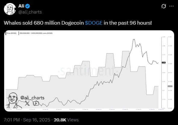 Chodzi o Dogecoina, który po mocnym tygodniu wykręcił dwucyfrowy wzrost. Jak pisze Ali Martinez w jednym z ostatnich postów na X w ciągu czterech minionych dni duzi posiadacze pozbyli się łącznie 680 mln DOGE. Dane, które rozpowszechnił Martinez, pochodzą z renomowanej platformy analitycznej „Santiment”.