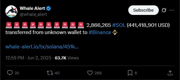 Eksperci zwracają uwagę na wieloryby, które wycofują swoje zasoby z giełd do prywatnych portfeli. Szczególnie ich uwagę przykuła jedna duża transakcja przeniesienia 2,8 mln tokenów SOL o wartości około 441 mln dolarów. Obserwatorzy obawiają się, że gdy wieloryby wykonują takie ruchy, to szykują się na nagłą sprzedaż. Jednak to tylko jeden możliwy scenariusz.