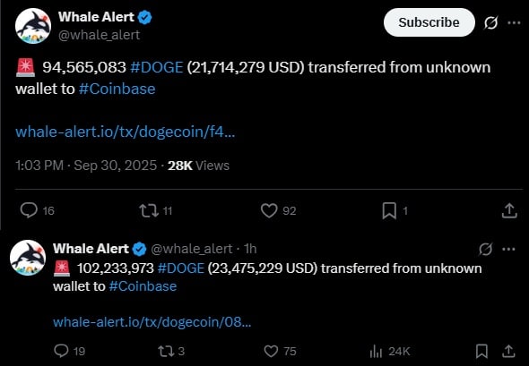 Jak wynika z informacji platformy Whale Alert kilku dużych graczy przeniosło znaczne ilości DOGE na giełdę Coinbase. Jeden z nich w ramach jednej transakcji przetransferował ponad 94,5 tys. tokenów na Coinbase o wartości około 21 tys. dolarów. Drugi wieloryb przeniósł na Coinbase ponad 102 tys. DOGE o wartości blisko 23,5 tys. dolarów.