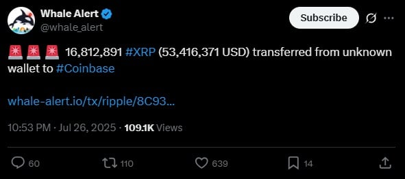 W ostatnich godzinach uwagę komentatorów przyciągają tajemnicze ruchy dużych posiadaczy. Wieloryby nie próżnują i ciągle wykonują ruchy, które wprawiają w zakłopotanie cały rynek. Szczególnie zastanawiający jest ruch jednego z dużych posiadaczy Ripple. Jak wynika z ustaleń Whale Alart, nieznany portfel przeniósł na giełdę Coinbase 16 812 891 sztuk XRP. Jak podała platforma, która śledzi wieloryby, w momencie transferu tokeny był warte ponad 53 mln dolarów.