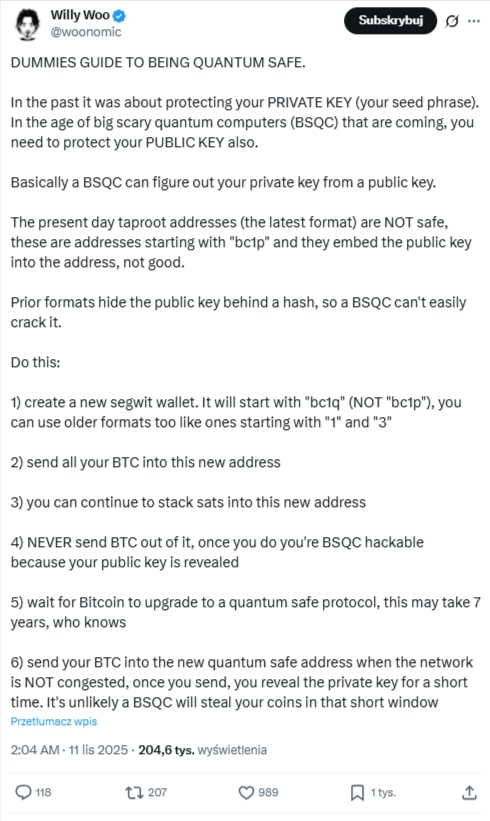 Willy Woo ostrzega, że obecnie mamy do czynienia z sytuacją, gdy na celowniku znalazło się jedno z najbardziej kontrowersyjnych zagadnień, które od lat rozpala wyobraźnię entuzjastów i krytyków kryptowalut: zagrożenie kwantowe dla Bitcoina.