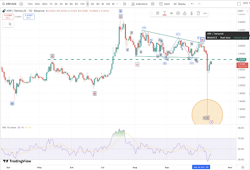 Litera „W” oznaczała kwietniowe minimum na poziomie 1,615 USD. Po tym minimum XRP odnotował wzrosty w formacji ABC, osiągając w lipcu szczyt na poziomie 3,67 USD, zidentyfikowany jako „X”. Po krótkiej korekcie do 2,96 USD nastąpiła kolejna fala konsolidacji ABC, która spychała ceny do kanału spadkowego.