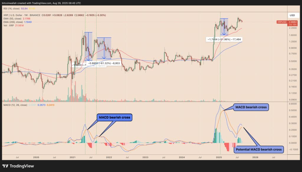 Z perspektywy analizy technicznej nie wygląda to optymistycznie. Indykator MACD na tygodniowym wykresie sygnalizuje możliwość tzw. niedźwiedziego przecięcia, które w przeszłości – w 2021 czy choćby w marcu tego roku zwiastowało spadki rzędu 50–60%. Jeśli historia miałaby się powtórzyć, kurs XRP mógłby spaść nawet w okolice 2,17 dol., gdzie przebiega 50-tygodniowa średnia EMA.